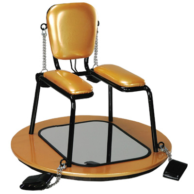 強制開脚の拘束椅子。背もたれ付きの「凌辱開股SMチェア」です。ゴールドの丸形の台座には足枷、背もたれには手枷がついていて相手を完全に拘束する。椅子の下には晒しミラーが付いており左右に分かれた椅子の間から局部が丸見えに…。※こちらの商品は受注発注品となっております。また大型商品の為、送料が別途必要になります。