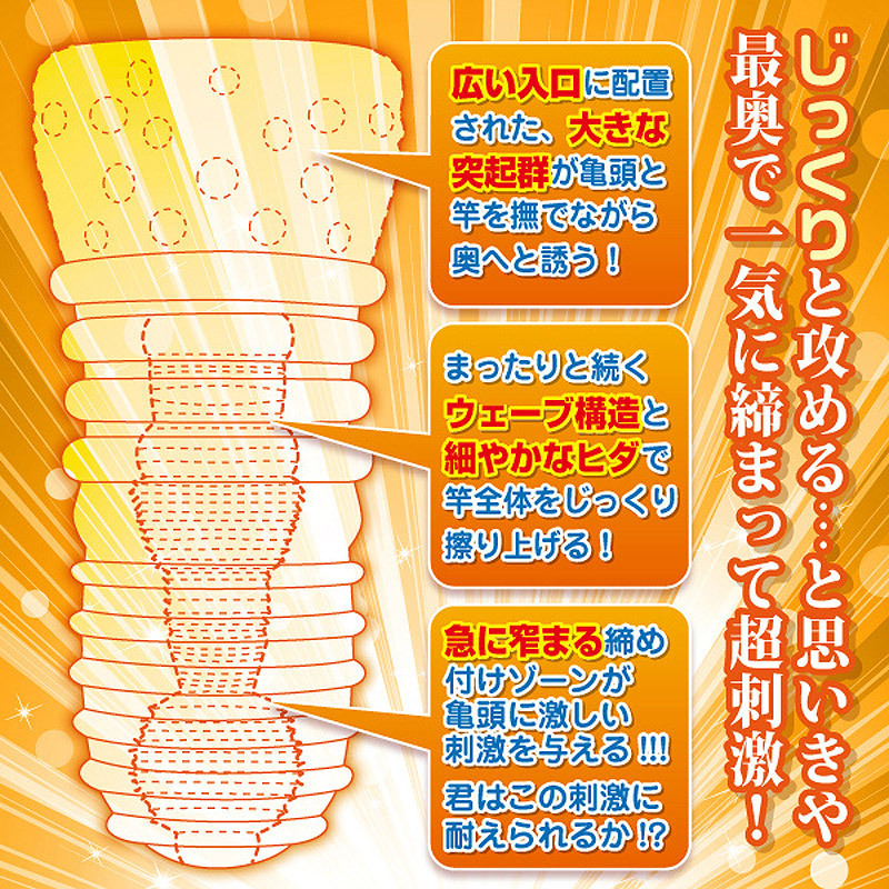 ●挿れやすさ満点の大きな挿入口●入り口から丸見えの突起群で奥へと誘導●中盤の微細ヒダでまったり&じっくり刺激●突然の極狭ゾーンで亀頭に高刺激●むっちり肉厚なハードエラストマー使用●ミニローション付属。