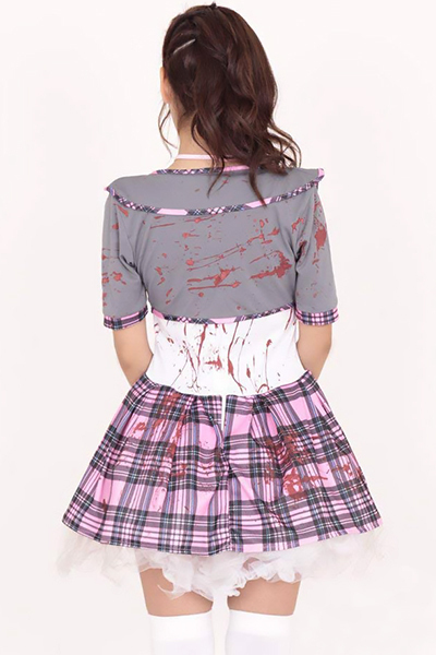 ●グレー×ホワイト×ピンクチェック●ワンピース・ボレロ・ネクタイのお得なセット●ボリュームたっぷりのパニエ付きスカート●血痕プリントがリアリティ満載。