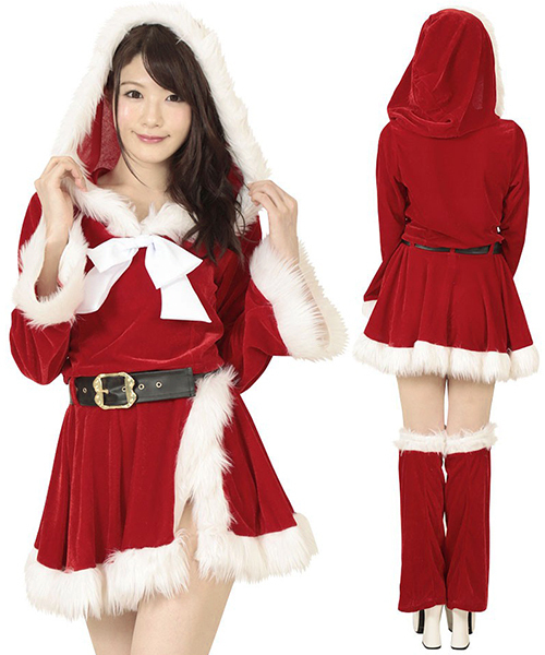 ●短め丈のセクシートップス●フェイクファーで縁取ったフード付き●大きめのフロントリボンがポイントに●巻きスカートにもファー付き●レッグウォーマーで脚元も可愛く●黒ベルトでウエストマーク。