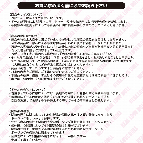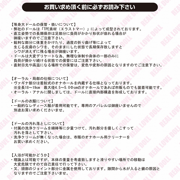 ●エラストマー素材のモチ柔人肌感●B76・W56・H77の抜群なスタイル●S〜Mサイズを着せられる身長135cm●可動する関節で多様な体位に対応●軽めのメイク済み・上品な顔立ち●目線や首の角度は自在に調節可能●口でのプレイも可能なリアル仕様●ヴァギナ:付属の専用オナホール●アナル:ドールの内部に直接成型●バスト:パイズリできる柔らかさ●小物も豊富な充実のセット内容。