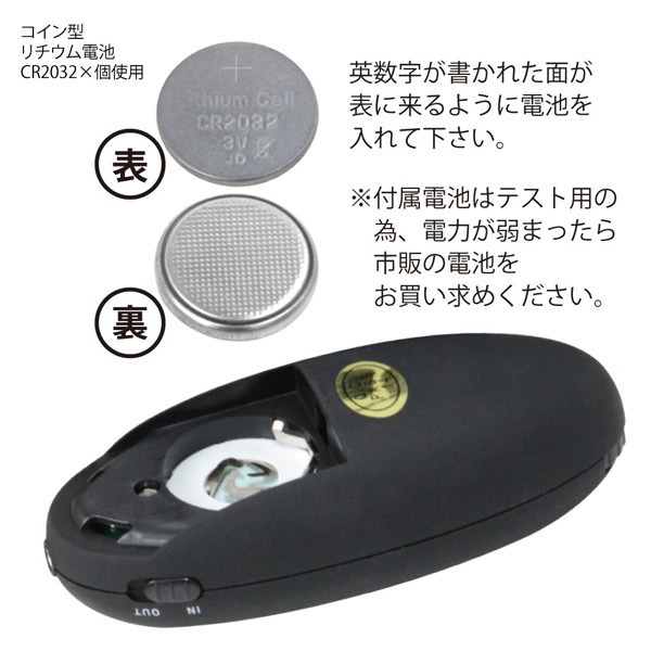 パッケージ:16.5×16.5×5.5cm 本体:クリップ部分開閉域〜2.0cm リモコン全長8.2cm 電池:ボタン電池(CR2032)×1個使用