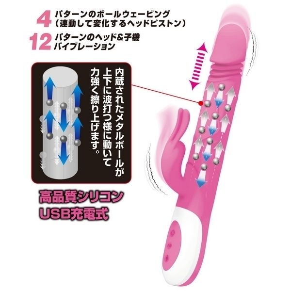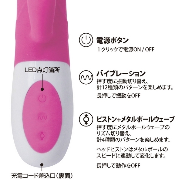 ●先端が上下に動くピストンモデル●内蔵ボールが波打つウェーブ機能●ピストン&ボールのパターンは4種類●ボールはピストンアクションと連動●ヘッド&クリバイブに12種振動搭載●手触りの良い高品質シリコンボディ●丸洗い可能な生活防水仕様で衛生的●タフなUSB充電式(専用コード付属)。