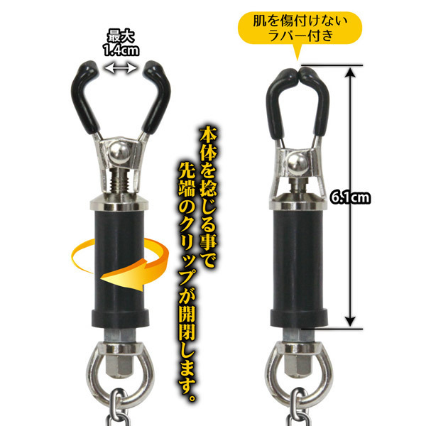2つのクリップを繋ぐチェーンの重みによる負荷で痛気持ち良さも増幅!締め付け具合でソフトからハードプレイまで幅広くお楽しみいただけるSMグッズです。