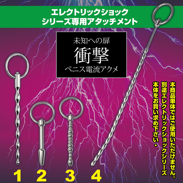 エレクトリックショックシリーズと繋げれば刺激の幅広がる!先端になるにつれて細くなる紡錘形のリング付き専用ブジーアタッチメント♪挿入部7.1cm×1.0cmの重厚なメタルボディで尿道から電撃低周波パルスを送ります。