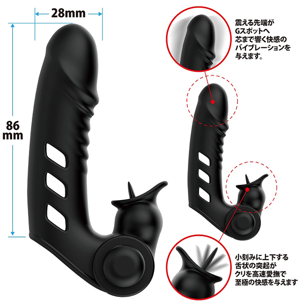 これさえあれば自分の指がクリバイブに大変身♪装着型のフィンガースリーブで、これを使うことでクリトリスを上下に小刻みに震えながら刺激しつつ、指先でGスポットをダイレクトに刺激といった2点責めが行えます。