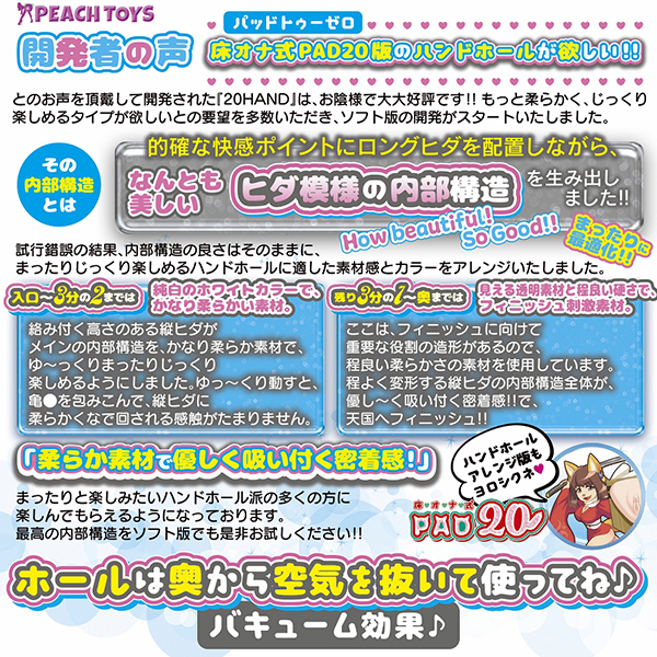 『手前でまったり密着♪奥でフィニッシュ!』まったりと楽しみたい!20HANDに白いSOFTバージョンが出たよ!!もっと柔らかく、じっくり楽しめるタイプ白い「20HAND SOFT(トゥーゼロハンドソフト」の登場です!「トゥーゼロ」内部構造とは『的確な快感ポイントにロングヒダを配置しながら、なんとも美しいヒダ模様』内部構造の良さはそのままに、まったりじっくり楽しめる!非貫通/ローション付