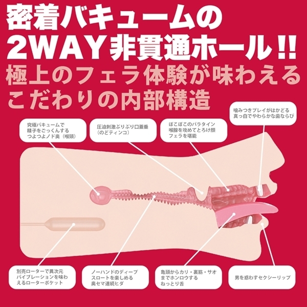 ●内部構造・男を惑わすセクシーリップ・噛みつきプレイがはかどる真っ白でやわらかな歯ならび・亀頭からカリ・裏筋・サオまでホンロウする、ねっとり舌・ぼこぼこのパラタイン喉腺を攻めて、とろけ顔フェラを堪能