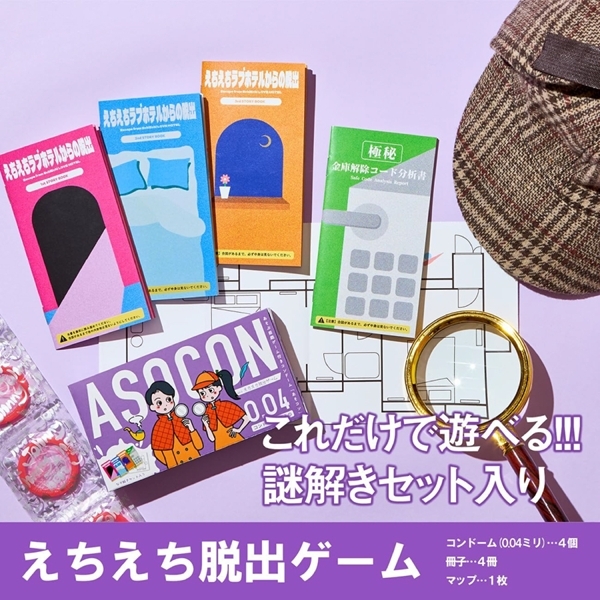 パッケージ:13.0×7.0×2.3cm 【セット内容】 コンドーム(0.04cm)…4個 謎解き用冊子…5種