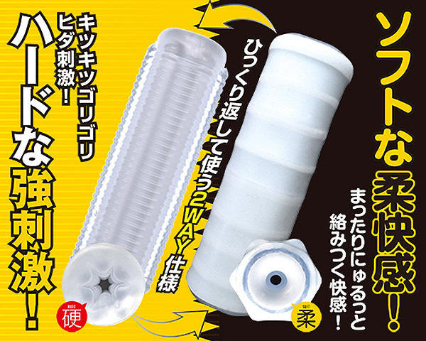 ●裏返して使うリバーシブルタイプ●ハード:クリア素材の細ヒダ構造●キツキツなゴリヒダの強刺激快感●ソフト:ふわふわ白素材の柔構造●にゅるっとまったり絡みつく快感●裏返しやすく洗浄しやすい貫通型。