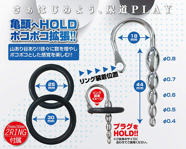 ショートサイズだから使い勝手が良く、先端部分のボールは4mm径から始まり、1mmずつボコボコが太くなりながら、最終的には8mmにまで達するという5段階の刺激が楽しめるタイプとなっています!リングのサイズは25mmと30mmの2サイズでご自身のサイズに合わせられるほか、メタル素材だから煮沸消毒ができたり耐性があったりと、しっかりとした使い心地が味わえます♪自分の好みのところへセットできたら、付属のリングでそのまま固定できるように設計されていますが、尿道プレイは危険を伴う場合もありますので、使用の際は、商品特性をご理解のうえ自己責任でお楽しみください。