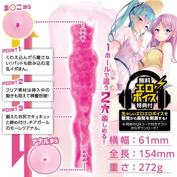 異なる内部構造を備えた2穴仕様の貫通型ホールです♪片側は無数の突起がやさしく包み込み、繊細な感触を演出します!もう一方はやや狭めの構造で、しっかりとしたフィット感が楽しめる設計です♪貫通型ならではの開放感があり、お手入れのしやすさも魅力です!柔らかすぎず、程よい弾力を持つ素材を使用しており、自然な使用感を実現しました♪本体は透明感のあるクリア素材で、内部構造を目でも楽しめるデザインです!手に収まりやすい約272gのサイズで、持ちやすさと安定感のバランスがとれています♪ASMR音声が楽しめる特典チラシも付属し、さらなる臨場感をプラスします!リアルな作り込みと実用性を兼ね備えた貫通型2穴ホールです♪