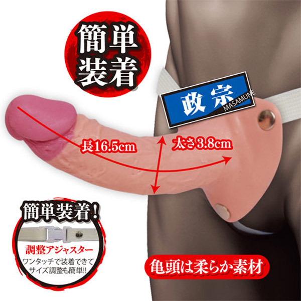 ●反りが逞しいロングな「正宗」●全長16.5cm、最大径3.8cm●亀頭は柔らかなぷにぷに仕上げ●男女ともに使える空洞ディルド●取り外せる3点固定式●カチっとワンタッチ装着のベルト●アジャスターでサイズ調節可。