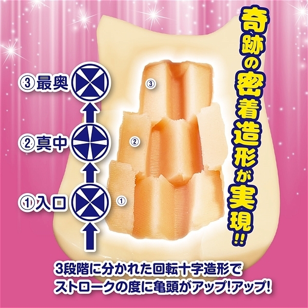 軌道がずれて快感が変わる!常にヒダ肉が食い込んでいるような密着快感!抜き時にはカリの部分に十字の回転肉密着ヒダが食い込む!気持ち良すぎて、もう手が止まらない!ストロークが止まらない!3段階に分かれた回転十字造形は、その度に亀頭がアップアップ!