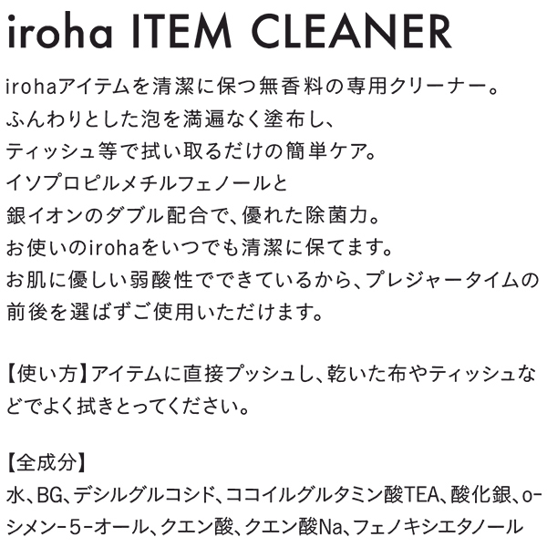 銀イオンとイソプロピルメチルフェノールのW配合で優れた除菌力を発揮!肌に優しい弱酸性仕様のiroha専用クリーナー50ml。
