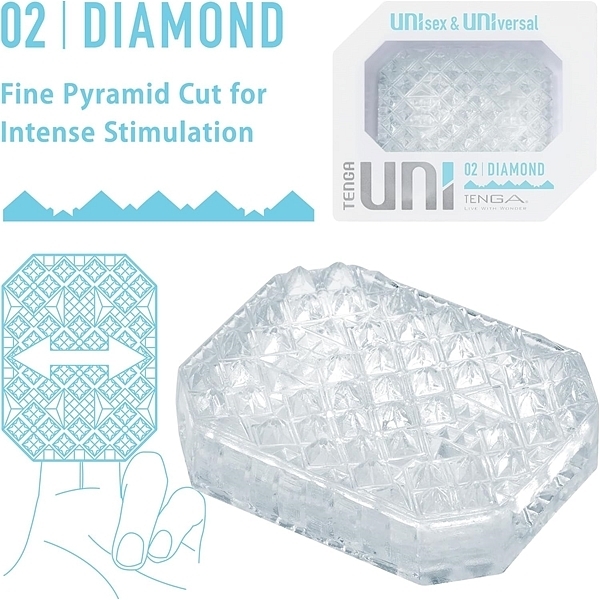 02 DIAMOND [ダイヤモンド]:細かなピラミッドカットが撫でる刺激均等に並んだ細かなピラミッドディテールによって、繊細に撫でるような刺激を楽しめます。