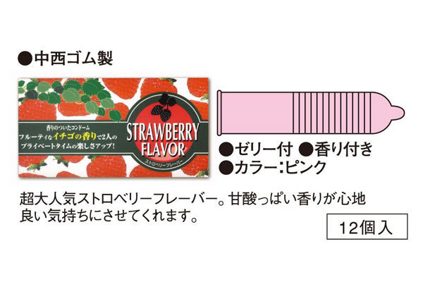 思わず食べてしまいたくなる?甘酸っぱいストロベリーの香り付きコンドーム「ストロベリーフレーバーコンドーム 12個入り」。