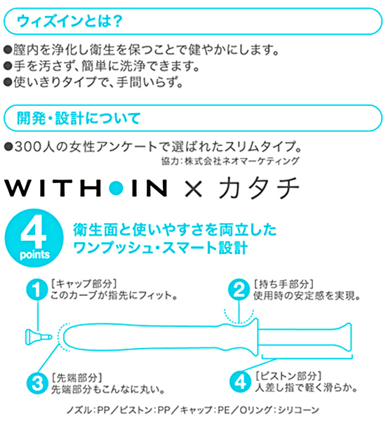 挿入しやすいスリムタイプで、衛生的な一回使い切りタイプ♪膣内に挿入してワンプッシュすれば手を汚さず簡単に洗浄できる!使い心地はとってもナチュラルで、初めての方でも安心してお使いいただけます。