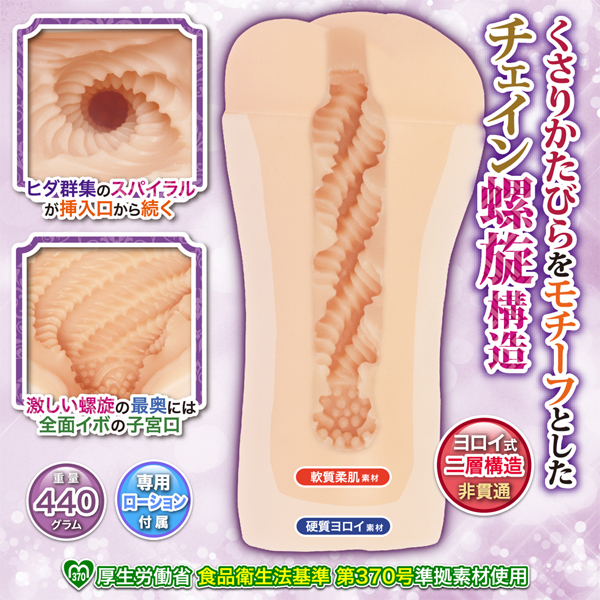 このスパイラル状のヒダ加工は、ペニスにシッカリと絡み付きながら、カリなどの敏感ポイントも重点的に摩擦。