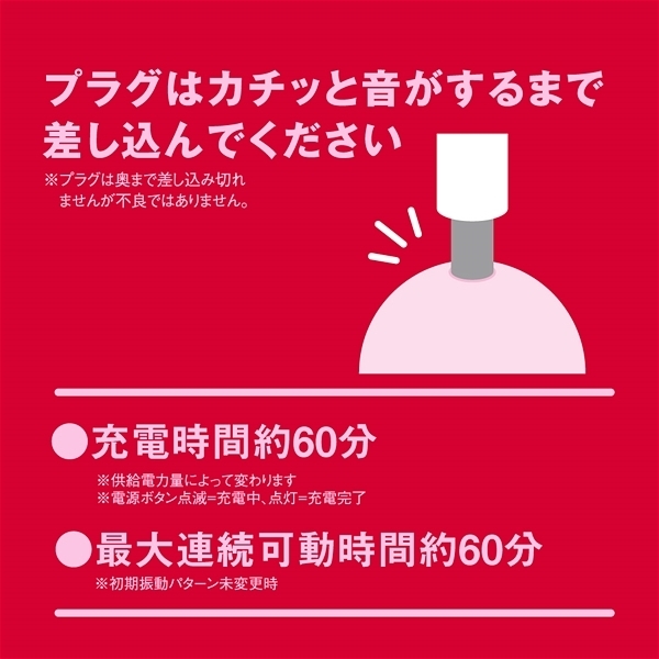 充電時間約60分(供給電力量によって変わります)最大連続稼働時間約60分(初期振動パターン未変更時)、付属品:USBフォーンプラグ式充電ケーブル